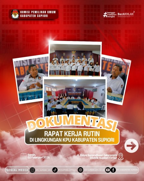 Hari ini Senin, 02 Februari 2026 Ketua, Anggota, Sekretaris, Kasubbag, serta Staf KPU Kabupaten Supiori melaksanakan Rapat Kerja di Lingkungan KPU Kabupaten Supiori guna mengevaluasi capaian kinerja pekan lalu dan memantapkan rencana kerja ke depan. Koordinasi yang solid adalah kunci pelayanan yang prima bagi masyarakat.