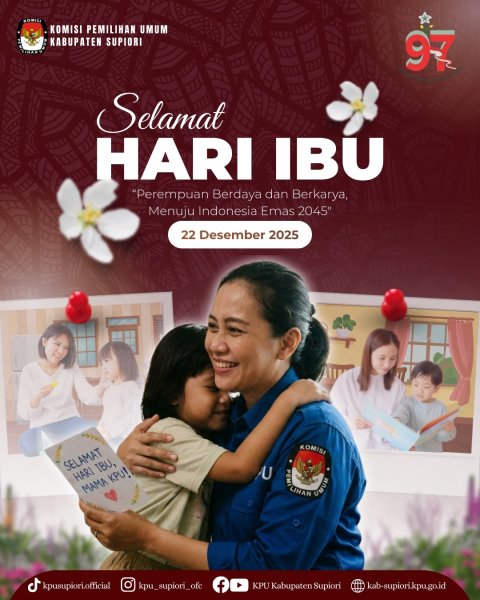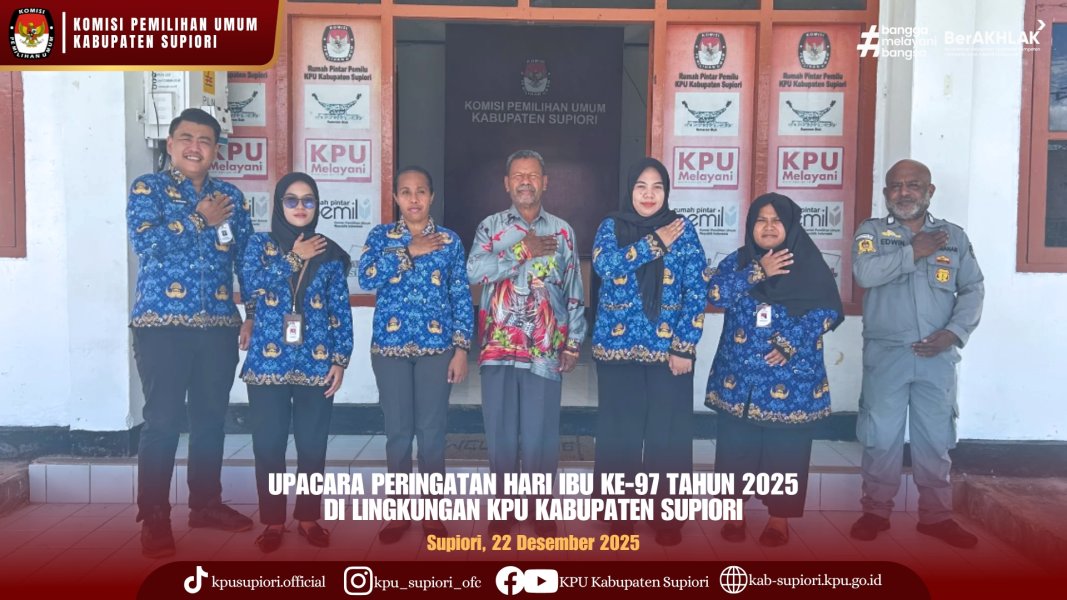 #Temanpemilih , KPU Kabupaten Supiori melaksanakan Upacara peringatan Hari Ibu Ke-97 Tahun 2025 pada Senin, 22 Desember 2025. Bertindak sebagai Pembina Upacara Ketua KPU, Uria Awom. Sedangkan, sebagai Pemimpin Upacara Staf Parmas dan SDM, Nicolas L.G. Puttileihalat.